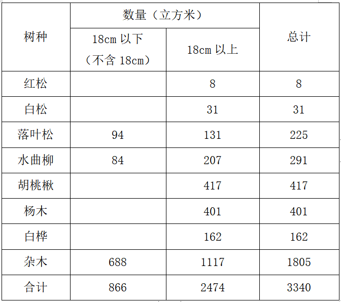 木材数量约3340立方米,具体情况见下表: