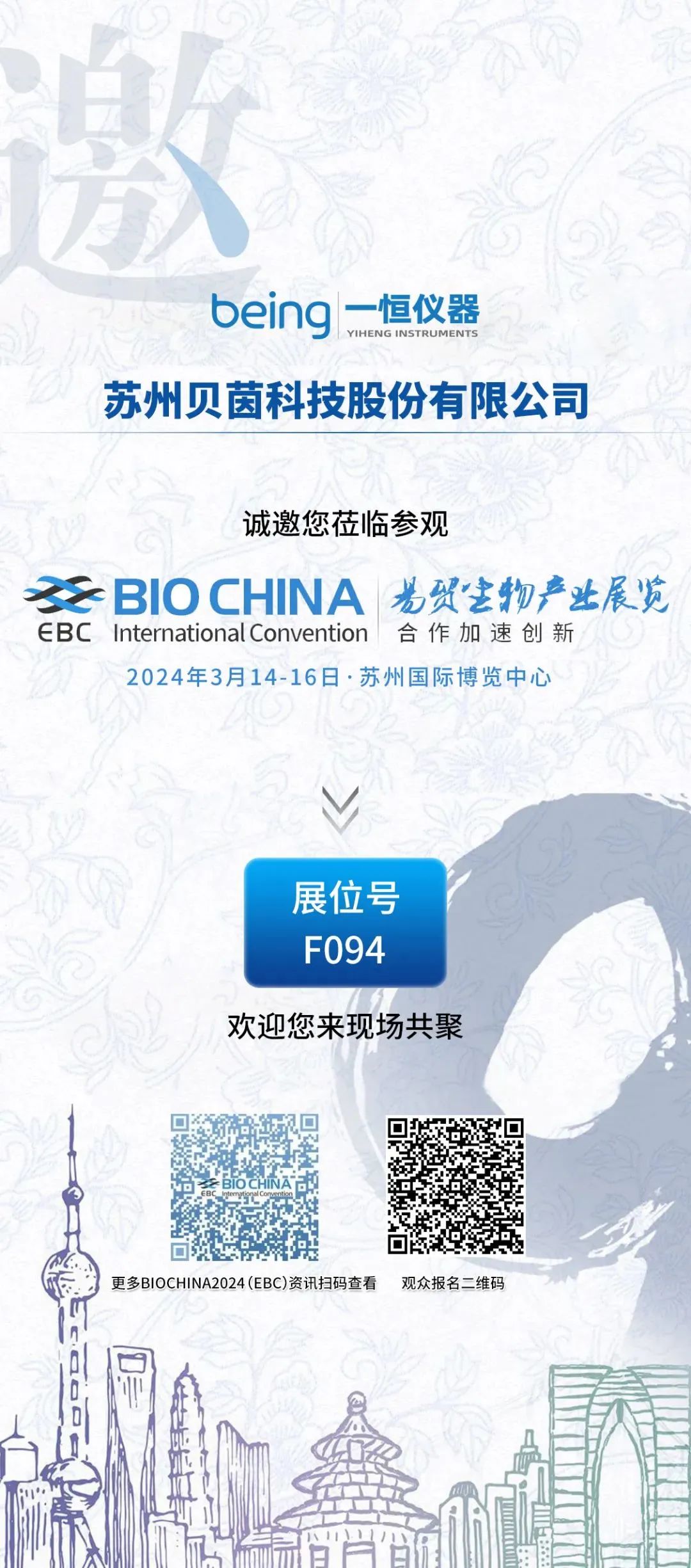 BIOCHINA2024(EBC)第九届易贸生物产业大会暨易贸生物产业展览将于2024年3月14-16日在苏州国际博览中心召开。贝茵科技将参加本次展会,欢迎各位届时前往F3馆F094展位交流垂询。