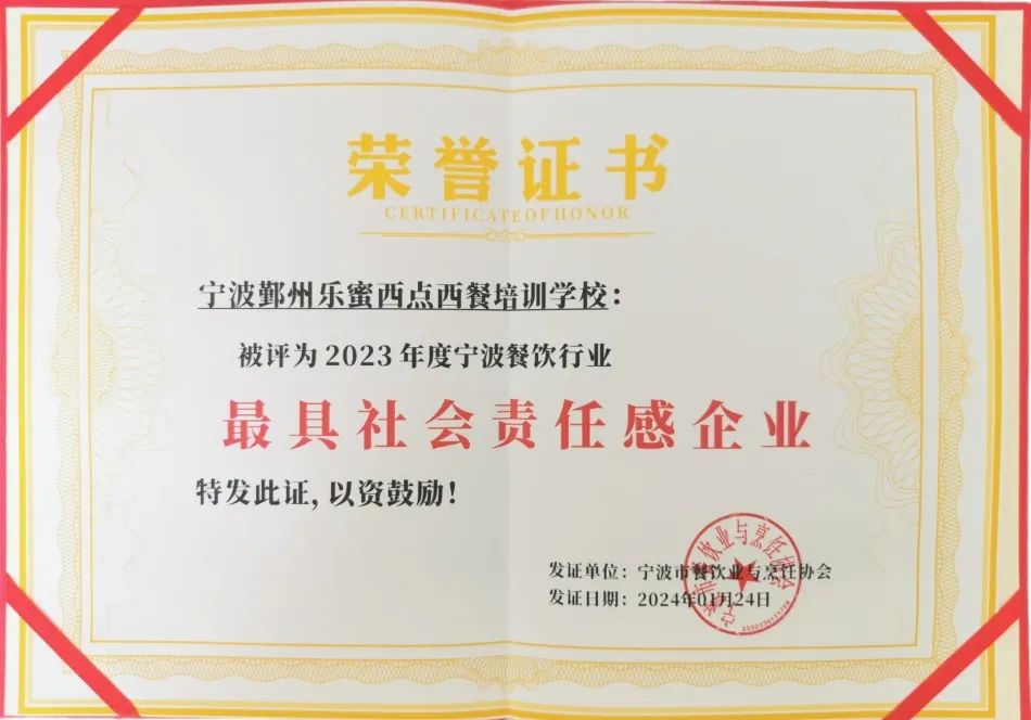我校荣获"2023年度宁波餐饮行业最具社会责任感企业"的荣誉称号,这一荣誉不仅是对我校致力于职业技能培训的肯定和鼓励,更是对我校坚守社会责任、积极回馈社会的嘉奖。