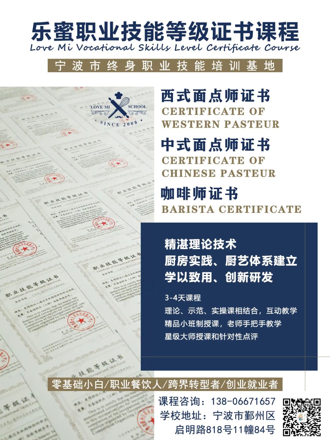 作为宁波市终身职业技能培训基地,我校积极响应政府号召,为中点、西点、咖啡等领域的职业技能培训提供支持。我们相信,通过这样的培训,可以帮助在甬劳动者提高自身技能水平,增强就业竞争力,为实现更高质量就业提供有力保障,从而帮助更多的人实现就业梦想。