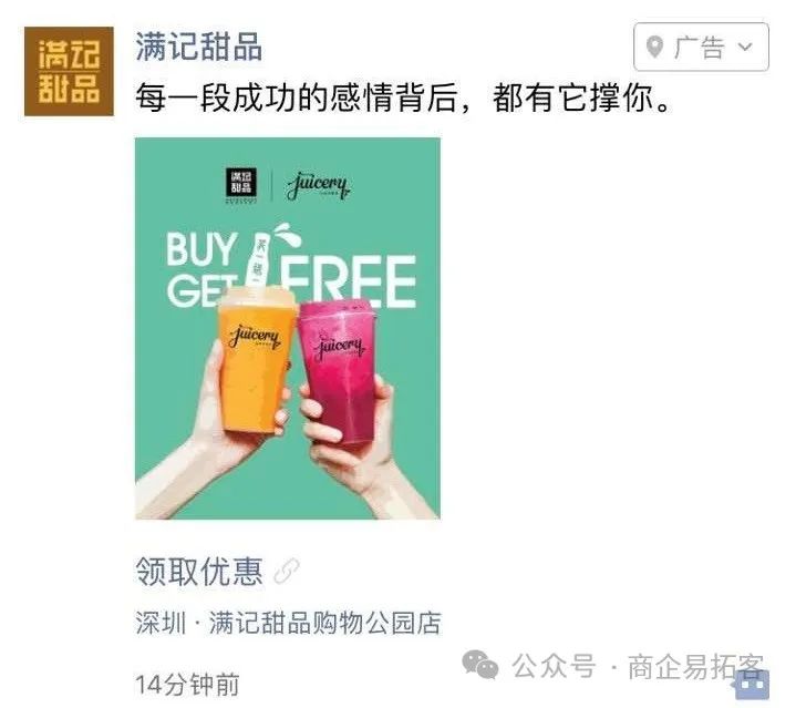 满记甜品新品果汁上市,为曝光新品,为门店拉动销售,投放了朋友圈广告。