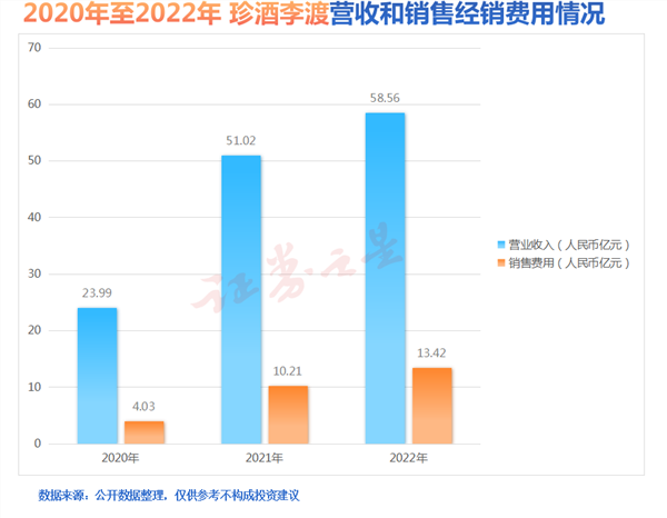 财报显示,2020年、2021年及2022年,珍酒李渡销售及经销开支分别为4.03亿元、10.21亿元及13.42亿元,于同期分别占公司总收入的16.8%、20.0%及22.9%。同期,广告开支分别为2.42亿、6.69亿以及6.66亿,三年时间,广告费就砸了15.77亿元。