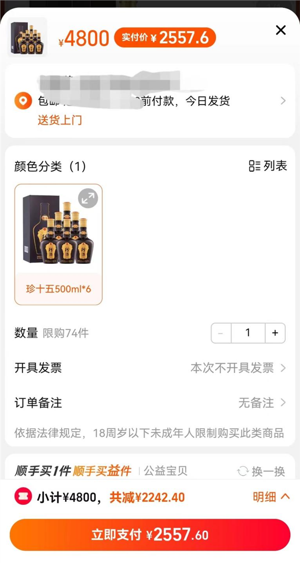 然而在电商平台珍酒的官方旗舰店,产品的价格却低于产品的指导价。以珍十五为例,每500毫升建议零售价为799元至999元,但珍酒官方旗舰店中,2557元就可以买到六瓶500ml的珍十五,每瓶合计约426元。