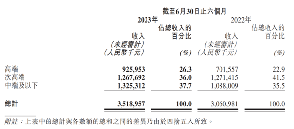 (珍酒李渡各档次产品营收占比 来源:珍酒李渡2023年中报)