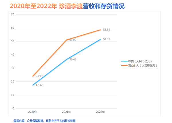 财务数据显示2020年至2022年,珍酒李渡存货分别为17.37亿元、36.49亿元及51.38亿元,与营收的比重分别为72.41%、71.52%、87.74%。并且珍酒李渡2022年存货金额是2020年的近3倍,远超营业收入增幅。