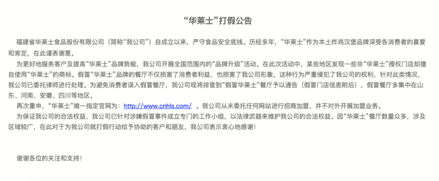 在华莱士官网有一页非常显眼的“打假公告”,公告中明确声明“公司从未委托任何网站进行加盟招商,并不对外开展加盟业务。”