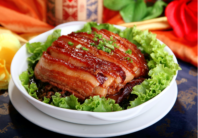 套餐菜品:神腿(红烧肘子)、蒸白合、五彩八宝饭、千张肉、火腿黄金大饼 红薯扎