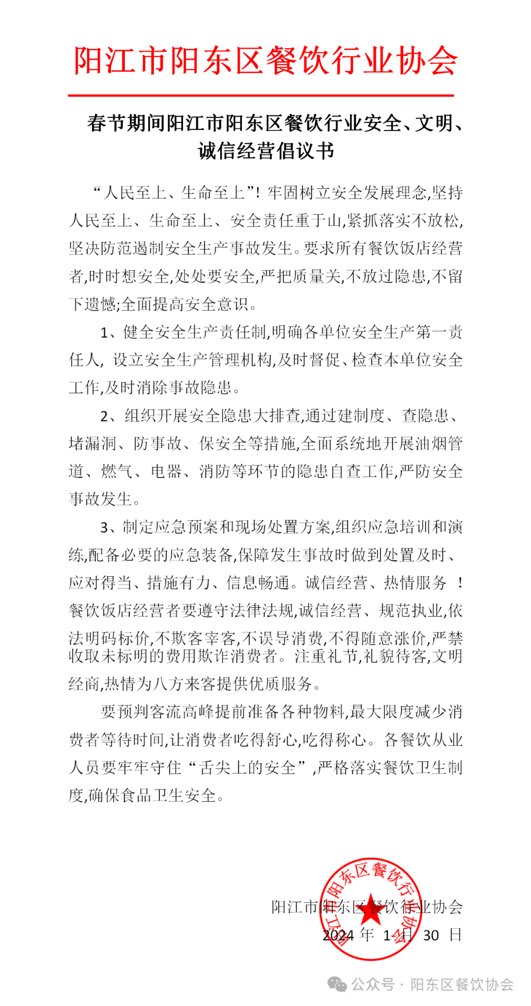 春节期间阳江市阳东区餐饮行业安全、文明、诚信经营倡议书