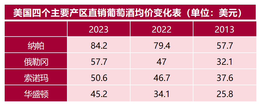根据硅谷银行优质酒庄数据库报表,2023年,美国优质高端品牌成功实现了逆势涨价,部分弥补了通货膨胀带来的成本增加,提高了销售额,尽管销量有所下降,但盈利可观。高端葡萄酒企的基础仍然较为牢固,赚钱的背后则是频繁提价。去年,69%的酒庄称,部分收回了因通货膨胀带来的成本增加,15%的酒庄表示,成本已完全收回。以下是2022、2023和十年前纳帕、俄勒冈、索诺玛和华盛顿四大主产区的直销葡萄酒均价,我们可以从中看出优质葡萄酒的价格涨势。