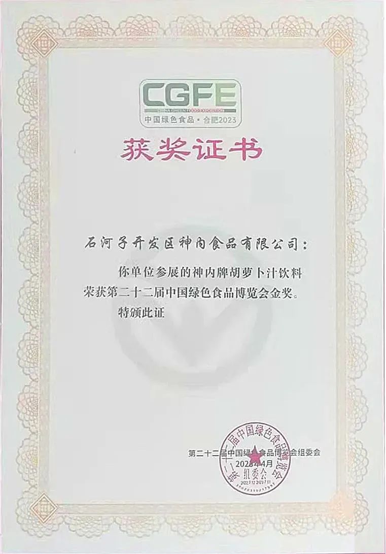 近日,第二十二届中国绿色食品博览会在合肥开幕。会上,石河子开发区神内食品有限公司生产的“神内牌”胡萝卜汁饮料荣获博览会金奖。