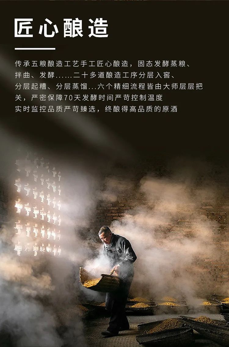 五粮液酒厂用"五粮配方,小麦制曲,人工培窖,双轮低温发酵,量质摘酒,按质拼坛,分级储存,精心酿造”的独特技术和悠久的传统工艺精酿而成。