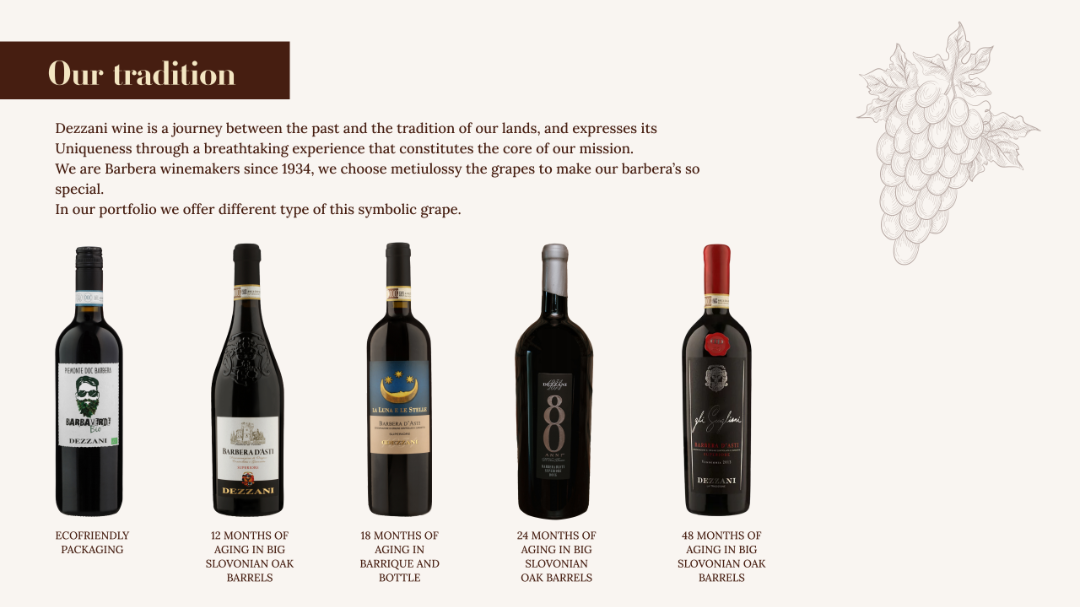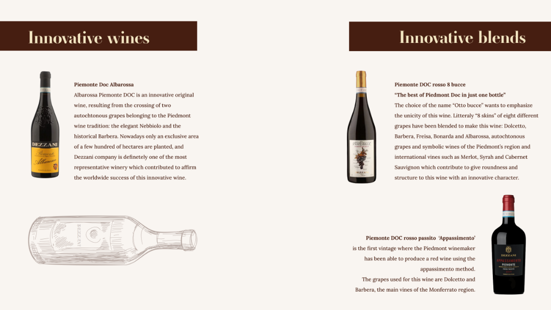 得益于强大的合作关系,Dezzani从Langhe和Monferrato最好的葡萄园收获葡萄,这使我们的葡萄酒具有典型性、明确的本质和特征。从葡萄园到酒窖,土壤和葡萄酒的特性保证了感官体验,品尝德萨尼葡萄酒仿佛是一段穿越朗格、罗埃罗和蒙菲拉托土地的旅程。