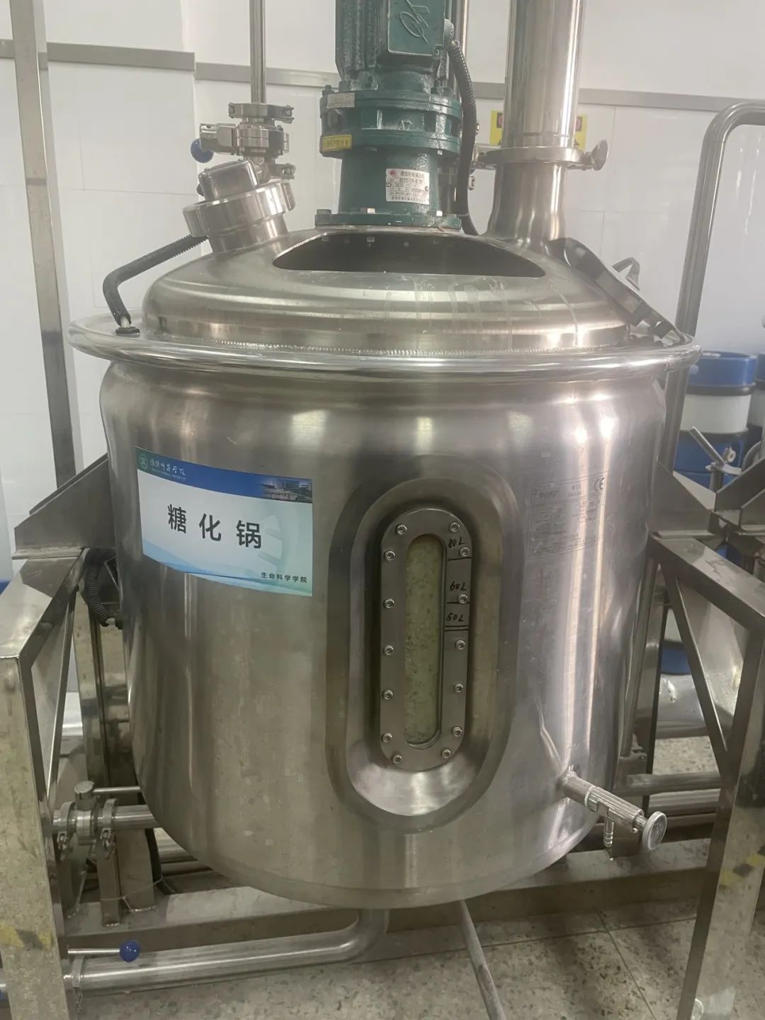 粉碎后的麦芽粉倒入糖化锅中,搅拌均匀。在此过程中,机器不断的搅拌麦芽浆,达到一定温度后,麦芽中的酶可以把淀粉转化成单糖、双糖、麦芽三糖等。