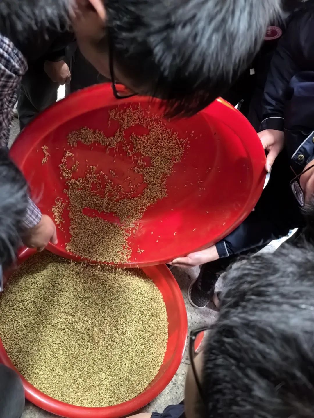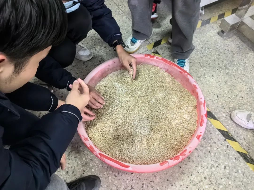 啤酒发酵的第一步是准备原料,同学们将麦芽倒入盆中,加入适量的水将其润湿。