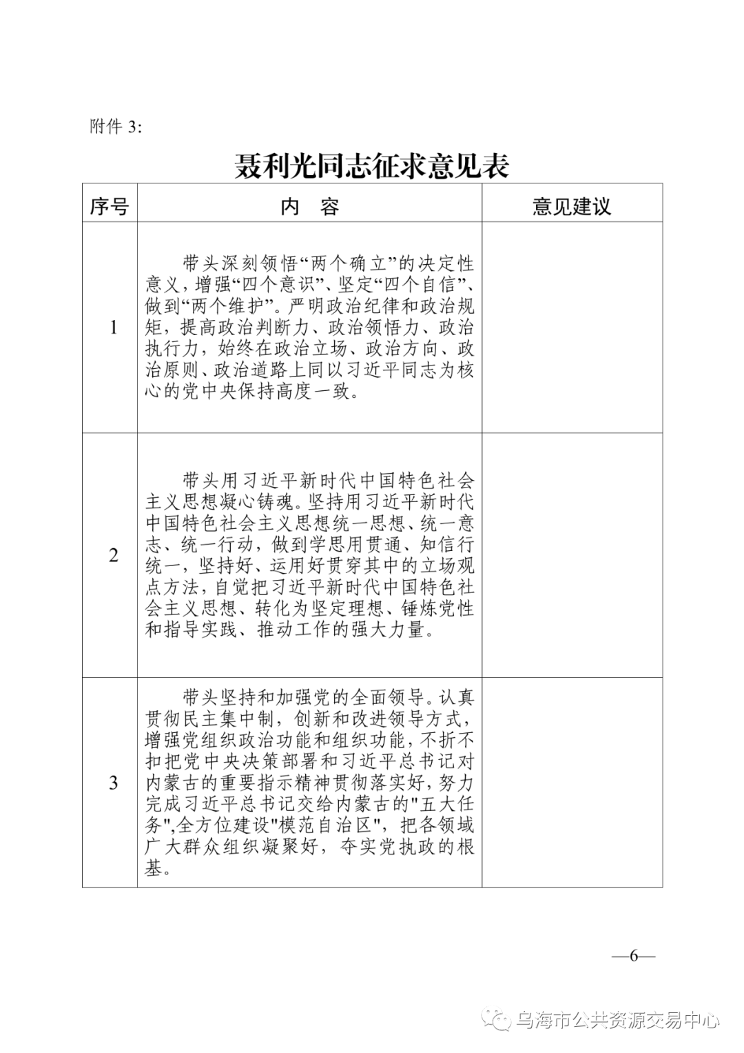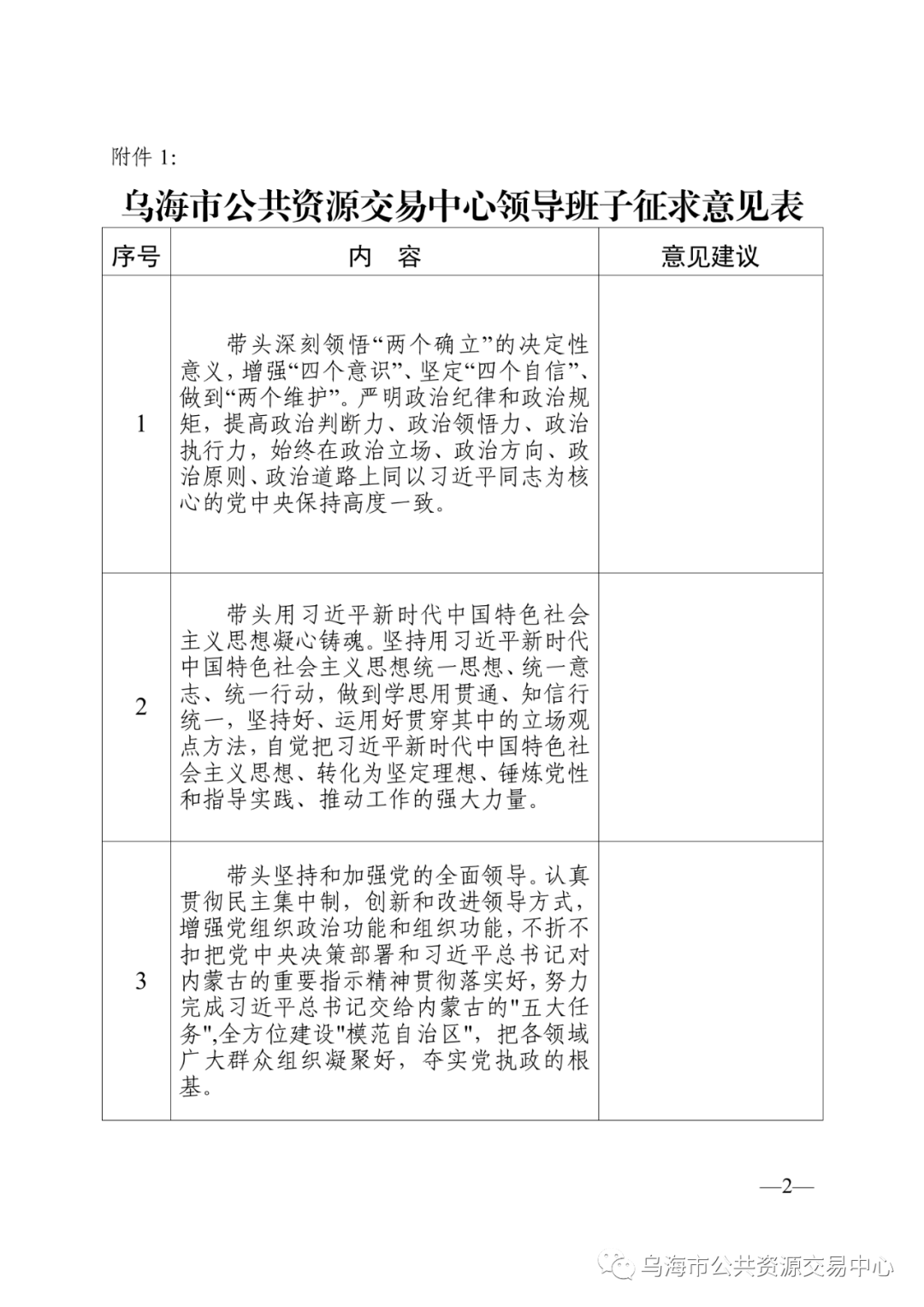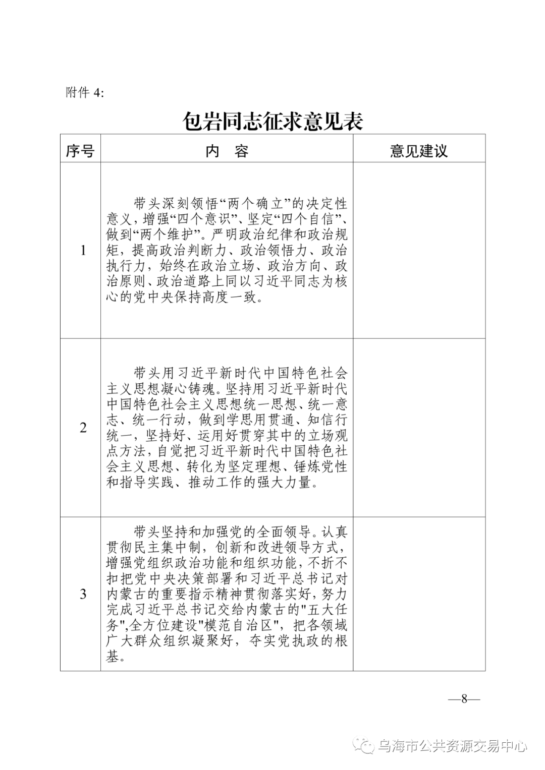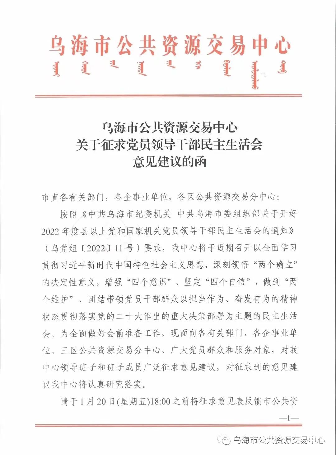 乌海市公共资源交易中心关于征求党员领导干部民主生活会意见建议的函