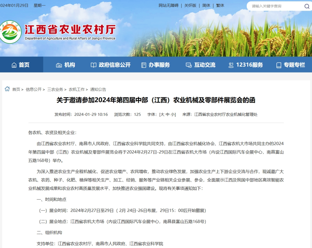 1月29日,江西省农业农村厅官网已正式发布《关于邀请参加2024年第四届中部(江西)农业机械及零部件展览会的函》,全文如下: