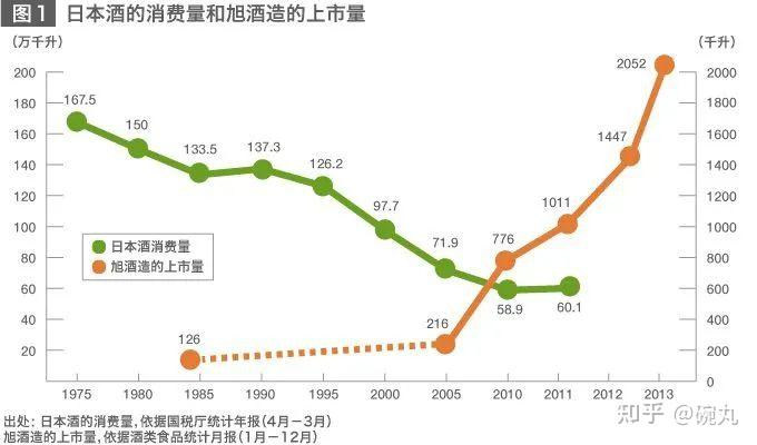 同样我们来看日本,日本经济低迷时期,整个酒类的消费量也是下降的,但高端品牌“獭祭”的销量却是逐年上升的。
