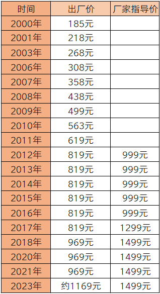 (2000年到2023年53°500毫升飞天茅台的出厂价和终端零售价)