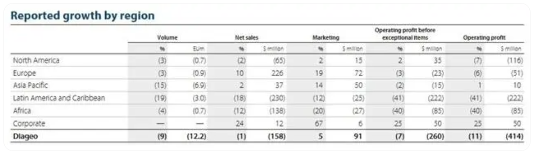 《快消品》从财报了解到,上半财年帝亚吉欧净销售额为109.62亿美元,同比下降1%;营业利润为33.17亿美元,同比下降11%;调整后的营业利润为35.10亿美元,同比下降7%,不及市场预期的41亿美元。从地区划分来看,拉丁美洲及加勒比地区表现最差,净销售额同比下降18%,营业利润同比下降41%;亚太地区净销售额同比增长2%,营业利润同比增长1%。