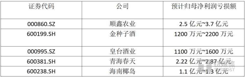 先来看白酒,钛媒体APP梳理发现,目前已有顺鑫农业、金种子酒、青海春天、皇台酒业、海南椰岛5家企业预计去年出现不同程度亏损,其中顺鑫农业亏损额最高。