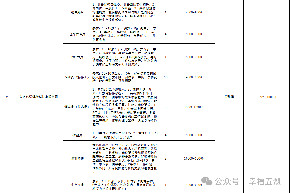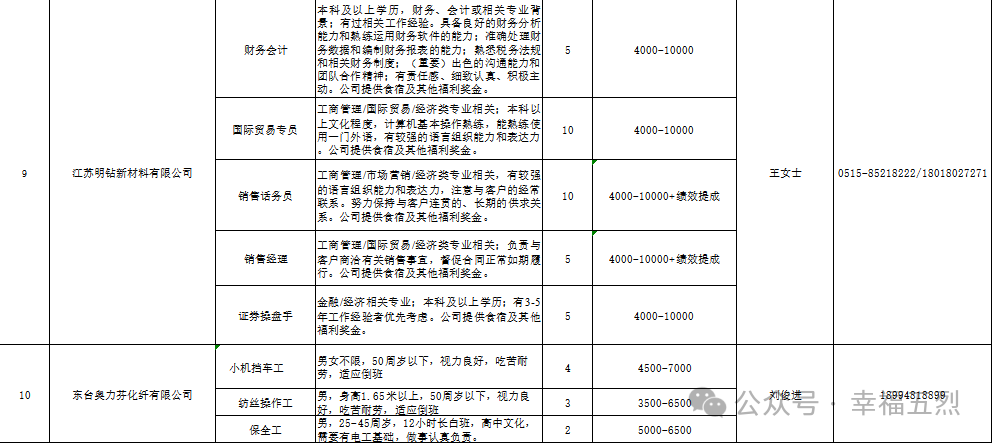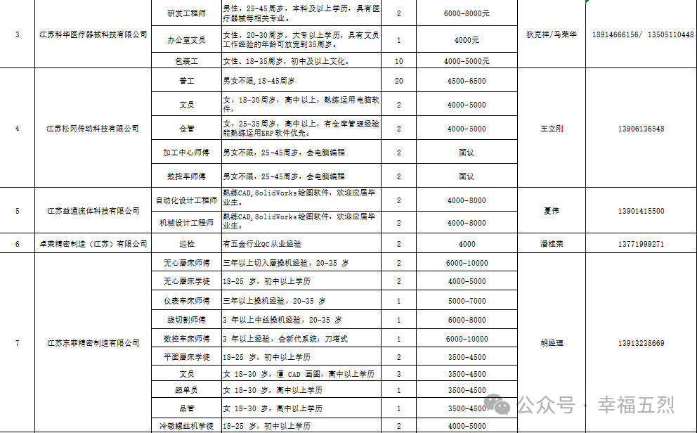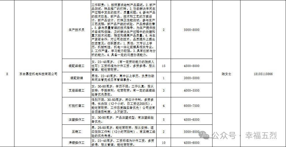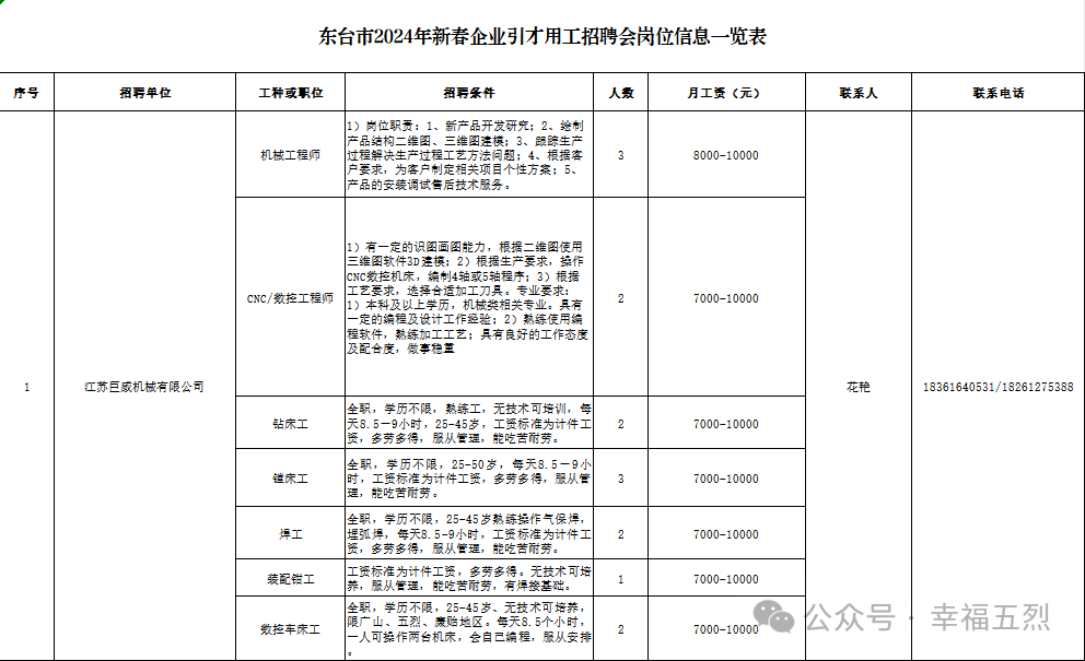 东台市五烈镇2024年新春企业引才用工招聘会岗位信息一览表