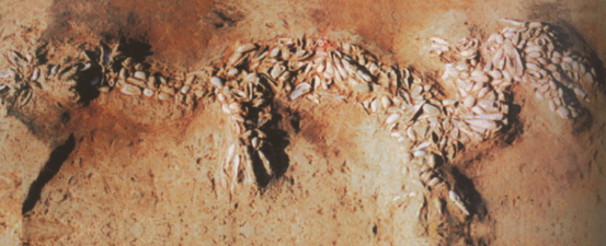兴隆洼文化辽宁阜新查海遗址出土的巨型石堆龙,距今约有8000年的历史,是迄今为止发现年代最早、形体最大的龙的形象。它以石块堆积而成,位于整个遗址聚落的中心,应与图腾崇拜和祭祀有关。