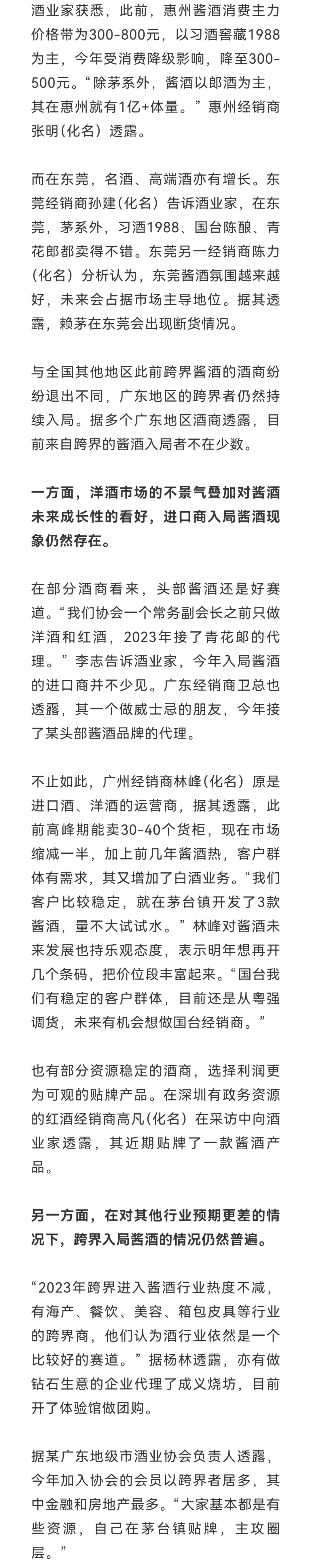 同时值得关注的是,与当前全国多地跨界酱酒经销商纷纷出局不同,广东地区进口商、跨界商持续入局酱酒的现象仍旧十分普遍。