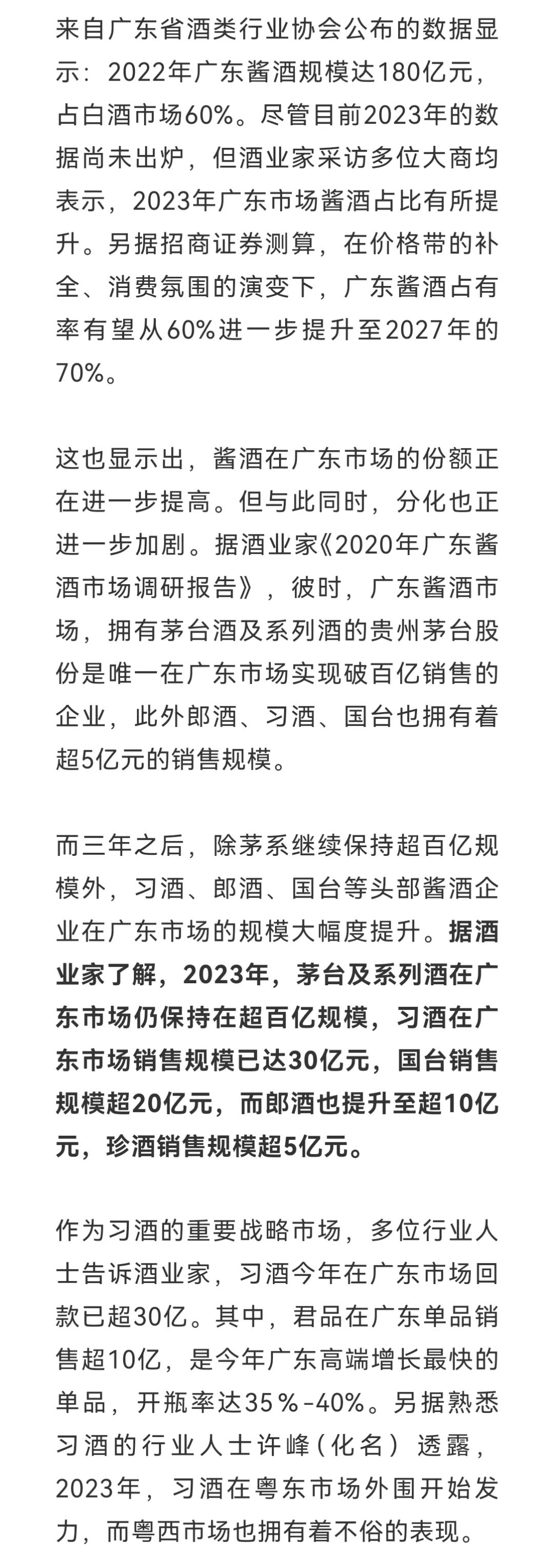 酱酒动销分化加剧,市场份额进一步向茅台及系列酒、习酒、郎酒、国台等头部酱酒品牌集中。2023年,茅台及系列酒在广东市场仍保持在超百亿规模,习酒在广东市场销售规模已达30亿元,国台销售规模超20亿元,而郎酒也提升至超10亿元,珍酒销售规模超5亿元。