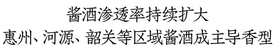 在酱酒渗透率上,除之前已拥有较高渗透率的深圳、广州、佛山等地区外,酱酒进一步向惠州、河源、韶关、汕尾等多地渗透,并开始在除广州、深圳、佛山以外的区域市场拥有较好的市场氛围;