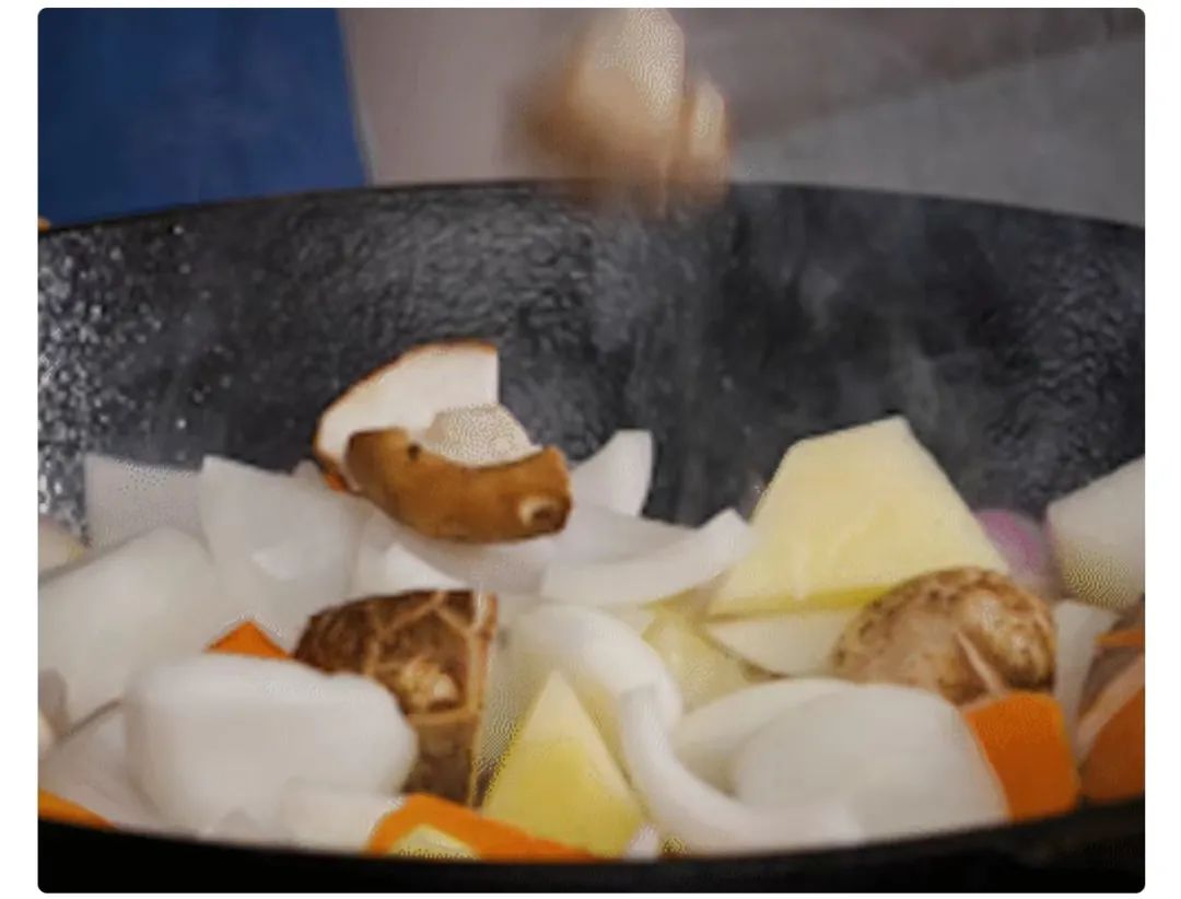 锅内倒入橄榄油,放入香菇、土豆块,微炒至变色;
