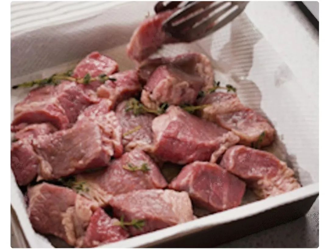 将红酒倒入切好的牛肉中,放少许百里香,用手抓匀并腌制6个小时;