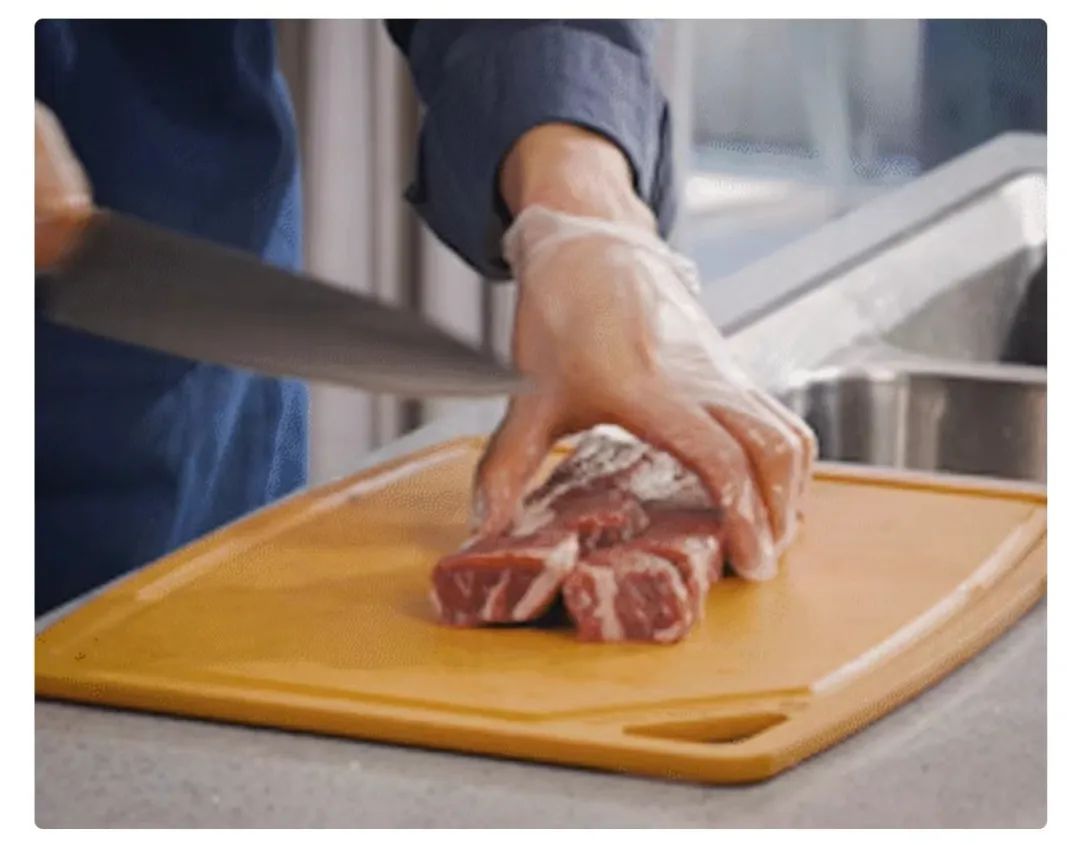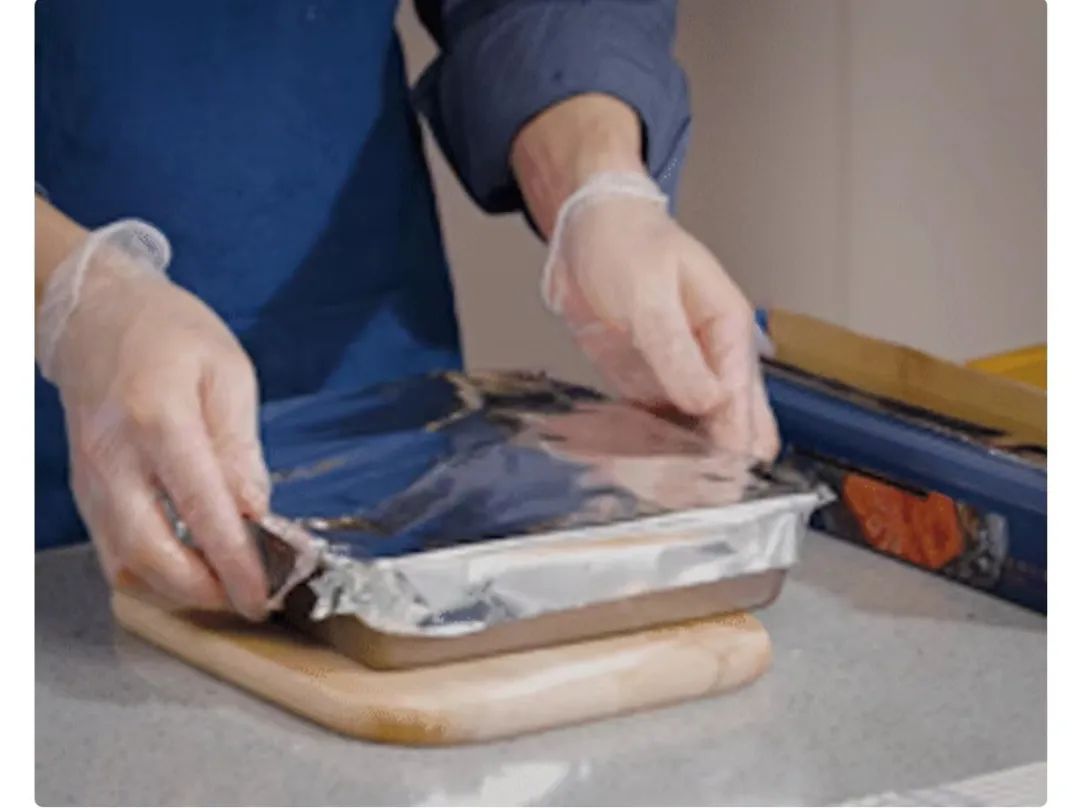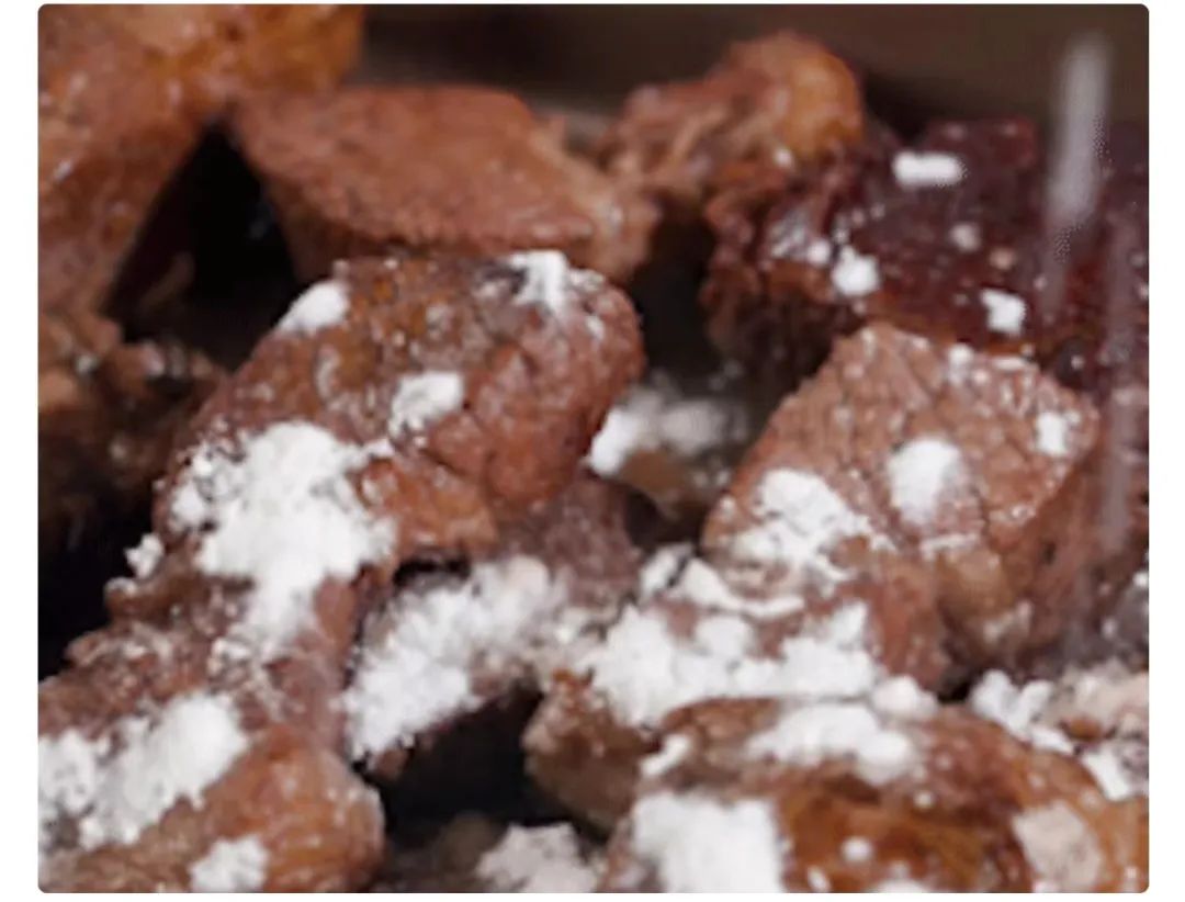 将煎好的牛肉捞出放入烤盘中,撒上50g面粉,均匀混合,包上锡纸,200度,烤5分钟;