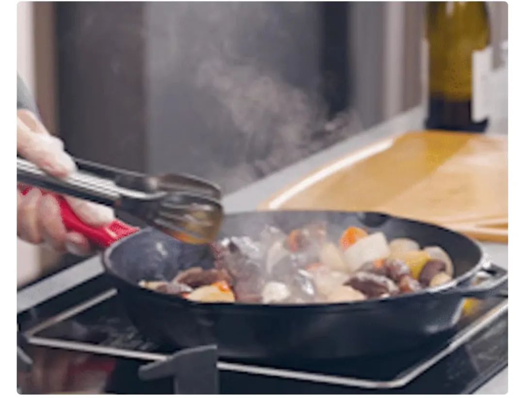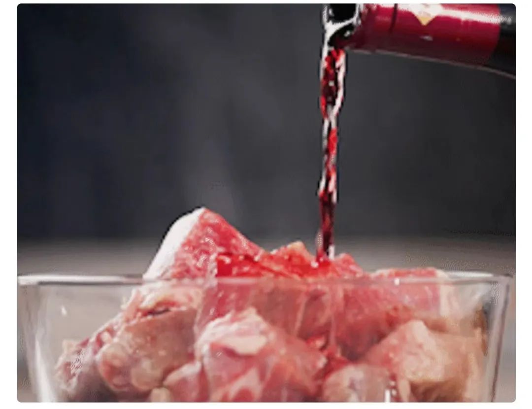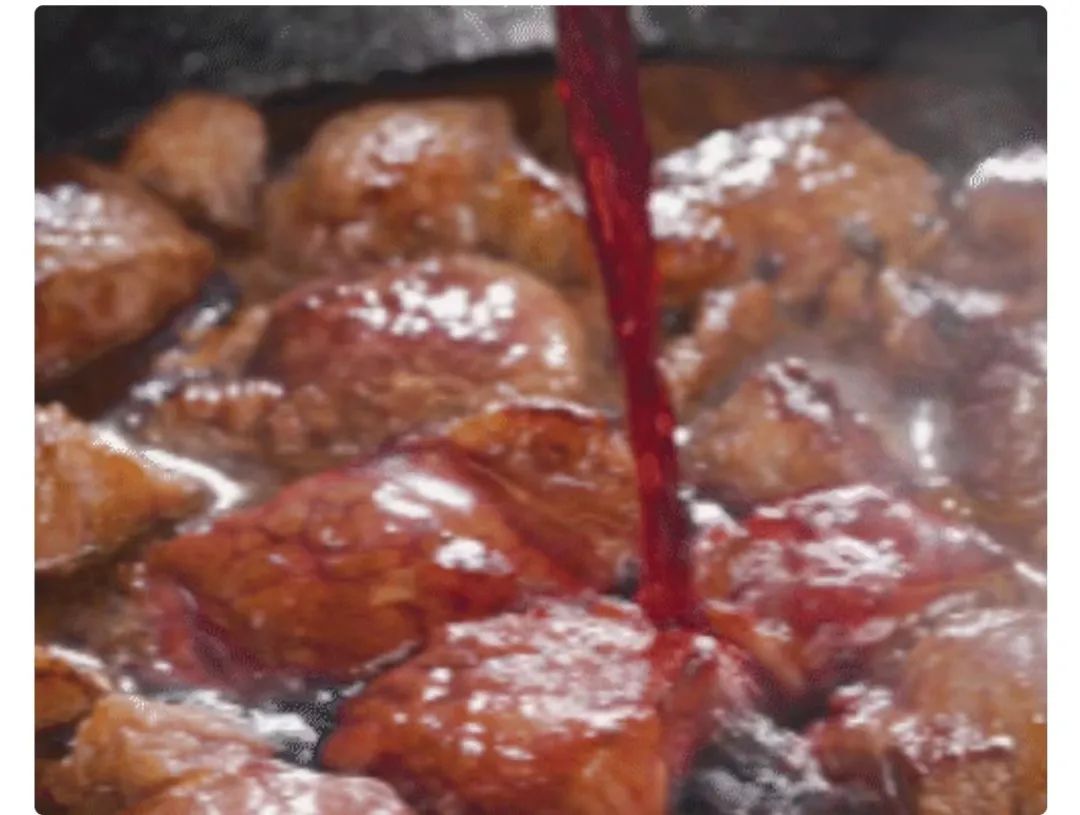 将腌制好的牛肉用厨房纸吸干水份,放入油锅中煎至变色,倒入红酒,没过牛肉,改善锅盖焖煮5分钟;