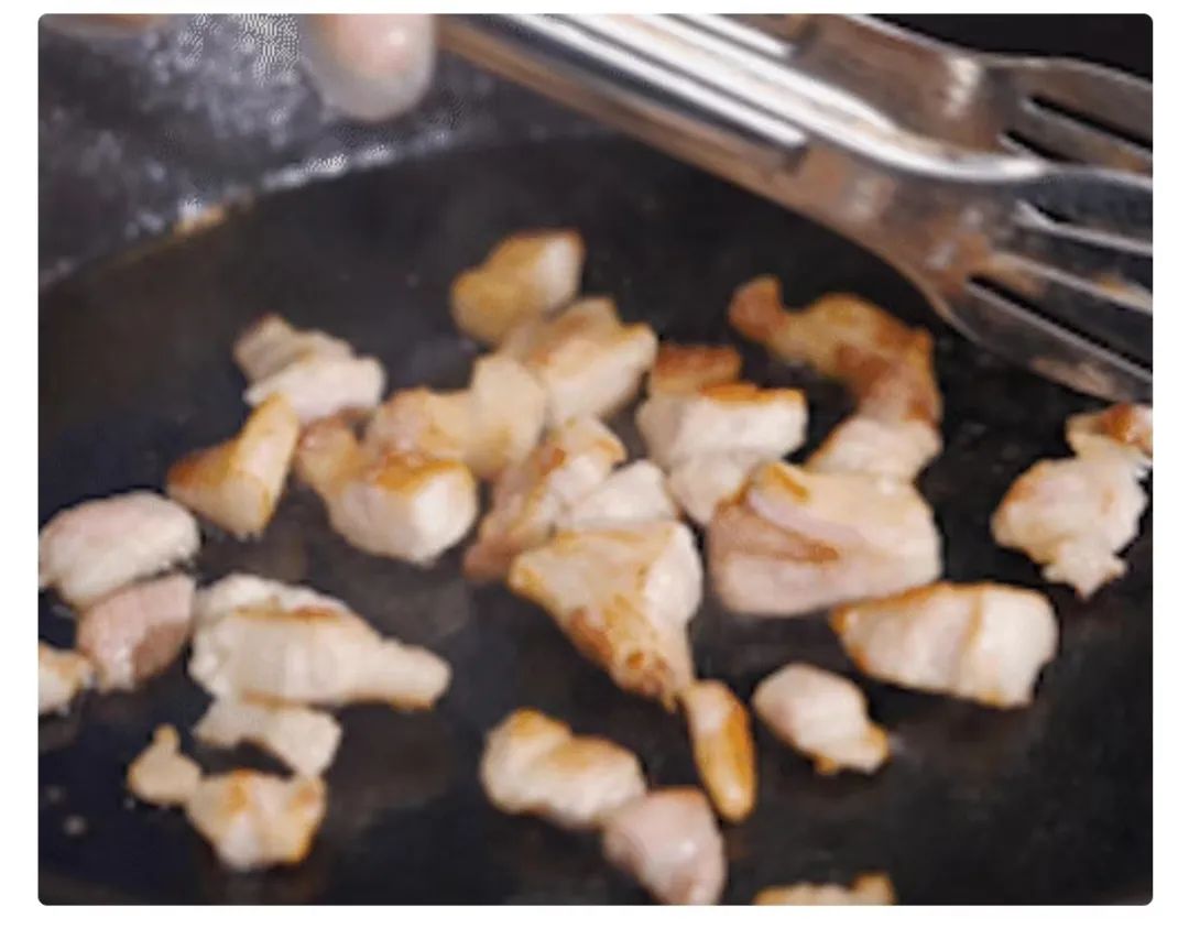 热锅热油下一半五花肉丁,煎至微黄出油,放入蒜碎、黄油进行煎炒;