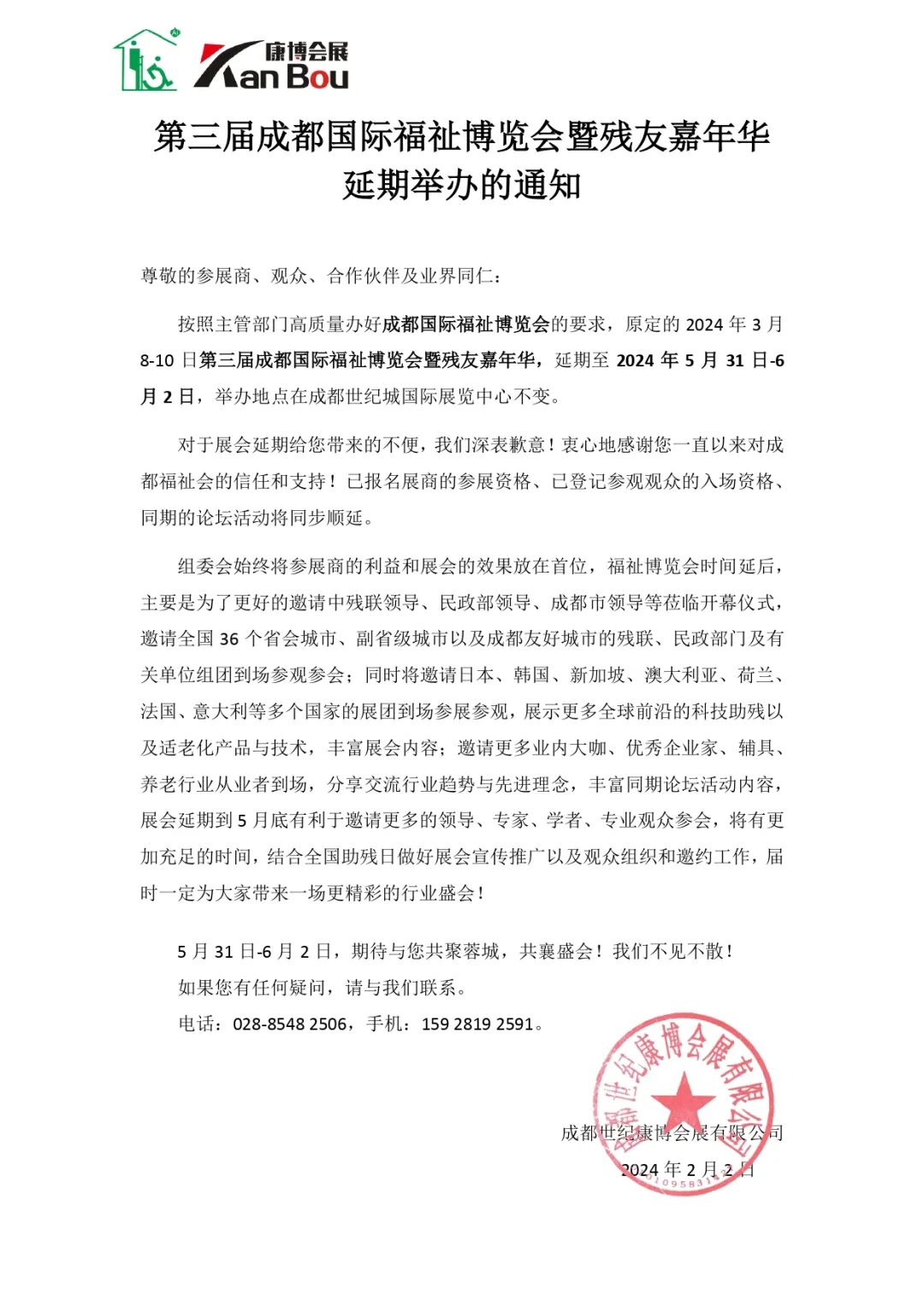按照主管部门高质量办好成都国际福祉博览会的要求,原定的2024年3月8-10日第三届成都国际福祉博览会暨残友嘉年华,延期至2024年5月31日-6月2日,举办地点在成都世纪城国际展览中心不变。