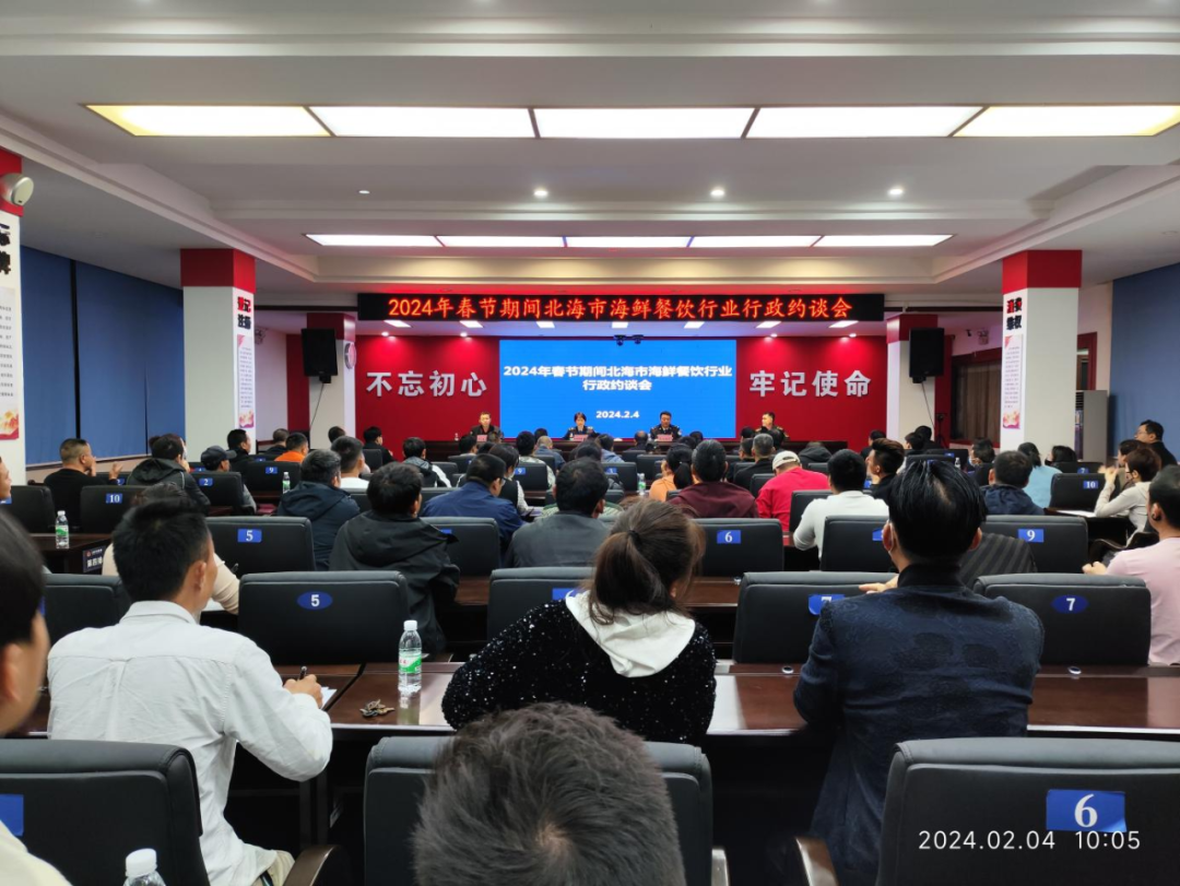 2月4日,北海市市场监管局联合市公安局、市交通运输局召开2024年春节期间北海市海鲜餐饮行业行政约谈会。会议对全市106家海鲜餐饮店业主进行行政约谈,通报了海鲜餐饮行业消费投诉热点,对海鲜餐饮行业提升服务质量、规范自身经营行为提出了具体要求,督促行业经营者履行法定义务和社会责任,共同打造北海海鲜餐饮品牌,提升北海市旅游消费环境。