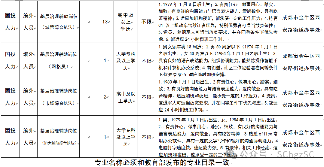 金牛区西安路街道办事处编外工作人员20名(其中:行政辅助岗位1名、负责统计、经济普查等相关行政辅助工作;窗口岗位2名、负责街道便民服务中心窗口工作,做好服务群众工作;基层治理辅助岗位(城市综合执法)13名、负责综合执法辅助工作;基层治理辅助岗位(网格员)1名、负责微网实格专职网格员工作,采集基层信息、化解矛盾纠纷、做好关爱巡防、宣传发动群众、做好平安建设、提升业务素能、做好服务群众工作;基层治理辅助岗位(市场综合执法)2名、负责综合市场管理工作;基层治理辅助岗位(治安综合协管)1名、负责协助做好治安辅助工作)。