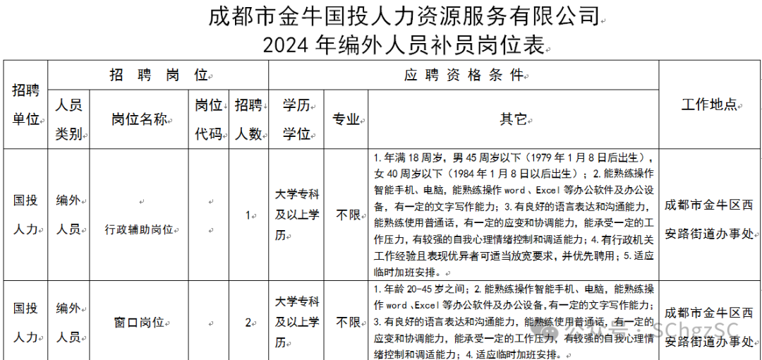 根据工作需要,成都市金牛国投人力资源服务有限公司(以下简称“国投人力”)面向社会公开招聘编外人员20名。现将有关事项公告如下: