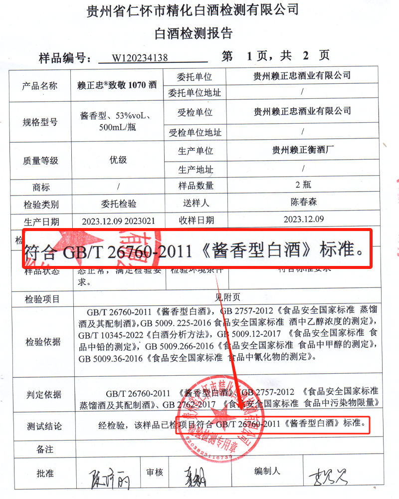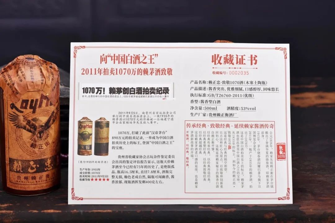 赖茅所承载的酒文化、酿造、工艺、勾兑、窖藏等社会价值和经济价值,在研究贵州酱香型白酒中有较高的参考和借鉴,属奢侈品中一类收藏品!2011年,1瓶产于1935年的赖茅酒,拍出了1070万,这是中国白酒拍卖史上的标王!拍卖获奖的赖茅酒是由赖贵山亲酿,而如今赖正衡酒厂董事长正是赖贵山女儿赖世玲,【致敬1070】是赖家匠心的传承。从1935年的标王,到如今的赖正忠致敬1070酒,这是经典与经典的隔空相望~赖正忠致敬1070产地源于茅台镇,其位于黔北赤水河中游,是一个蜿蜒的河谷地区,农作物主要是以高粱为主。随着白酒蒸馏技术的引入,高粱的价值也逐渐显露出来。茅台镇当地红粱颗粒坚实、饱满、均匀、粒小皮厚,支链淀粉含量超过90%,非常适宜多轮次蒸煮。红缨子高粱富含单宁,在发酵过程中会形成儿茶酸、香草醛、阿魏酸等酱香酒前体物质,后形成特殊的芳香化合物和多酚类物质。酿出来的酒体晶莹醇厚,香气悠久,味道醇厚,口感清香绵长,各味谐调一切都是恰到好处。而茅台镇年平均温度16.7℃,湿热、潮闷。这种气候像是专为酿酒而生。天时地利自然不能缺少人和,茅台镇上制酒技术延续百年,工艺成熟,制作用心。赖正忠·致敬1070所采用的是酱香酒特有的“12987”酿造工艺,被录入国家非物质文化遗产。所谓“12987”,简单来讲,就是“一个酿酒生产周期、两次投料、九次蒸煮、八次发酵、七次取酒”。一年酿造周期慢工出酒,端午制曲,重阳下沙,摊琼拌曲高温堆积发酵,在此基础上,至少需要3-5年才能投放市场。对于真正的大曲坤沙酒来说,12987工艺与之相辅相成。离开茅台镇的12987工艺,坤沙酱酒无从谈起。从长在地里的红高粱,到大家手上的一瓶酒,每一滴酱香酒都蕴含着时间的韵味。所以赖正忠致敬1070,才能幽雅细腻,酒香醇厚,不管是自己小酌还是朋友一起,都是一种享受。作为一个资深酒迷,我很喜欢闲来无事喝一点赖正忠致敬1070。拧开盖子倒进酒碗的时候,很自然的酒香就溢出来了,是沁人心脾的香味~酒体微黄清透,内里不含一丝杂质,因为没有添加任何调剂,晶莹剔透,也是一种视觉享受。喝下去的时候清冽的酒顺着喉咙进入体内,顺滑绵长,回味无穷。酱香型白酒国家标准中明确规定,需以高梁、小麦、水等为原料。经传统工艺酿造而成,并对检验规则、标 志、包装、运输和储存等均有详细规定。不得添加其他多余成分及非白酒发酵产生的呈香呈味呈色物质的。赖正忠致敬1070配料表仅有3个原料:高粱、小麦、水!水是取自于赤水河,高粱为主要原料,小麦进行人工高温制曲,剩下的都交给了时间!陈酿出的赖正忠致敬1070,色、香、味俱全,浓香醇厚,空杯留香。酒越醇厚,它的张力也就越好,倒出来的酒花也会更加好看,高且细腻。像赖正忠致敬1070的酒花倒出来可以明显的看到十分均匀、密集、细腻、而且十分好看。细细品味,醉心不醉头,从舌尖到心尖,每一次品尝都是享受~致敬1070,人工酿造工艺
