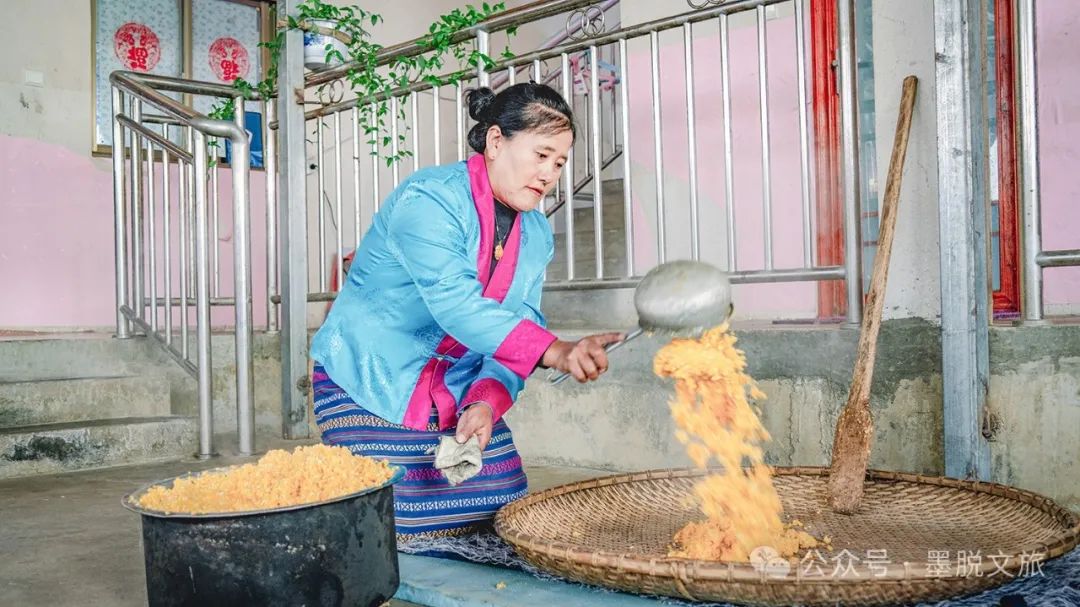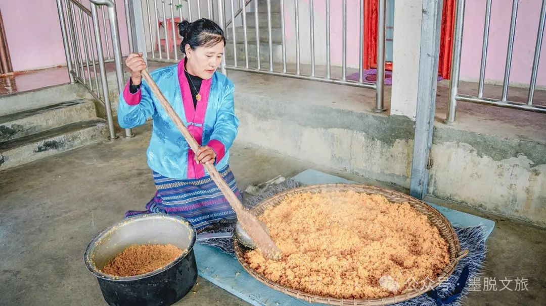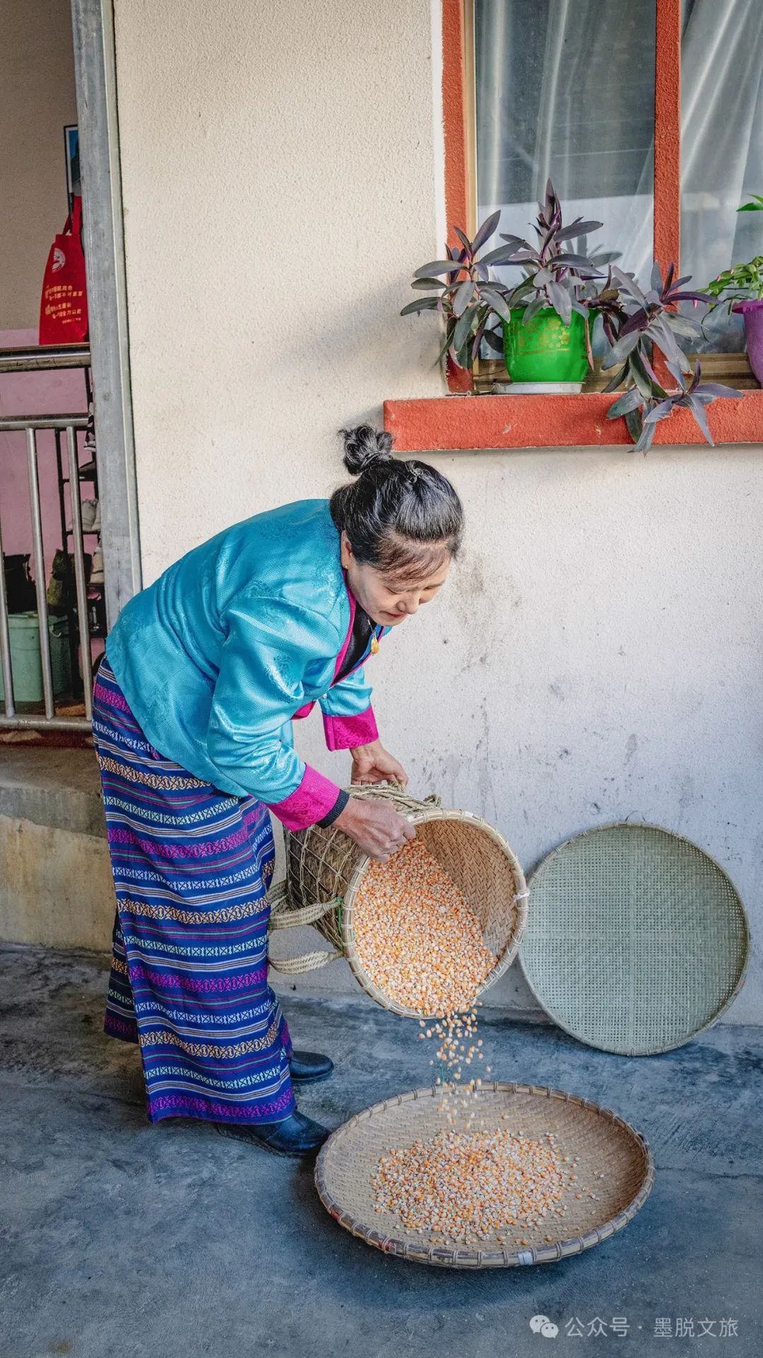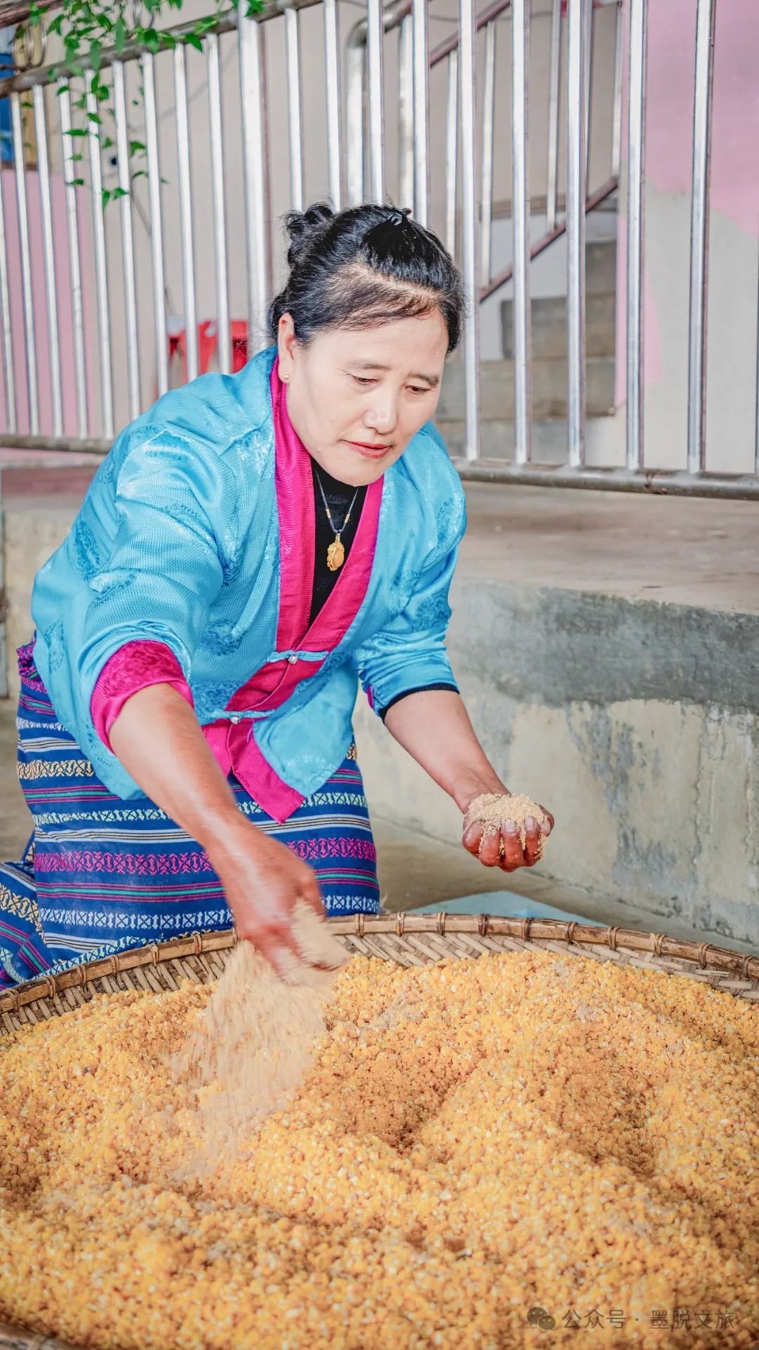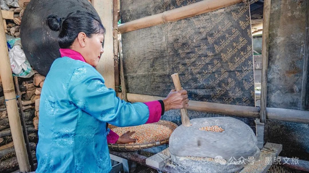 将晒干后的玉米用石磨研磨成细小的颗粒