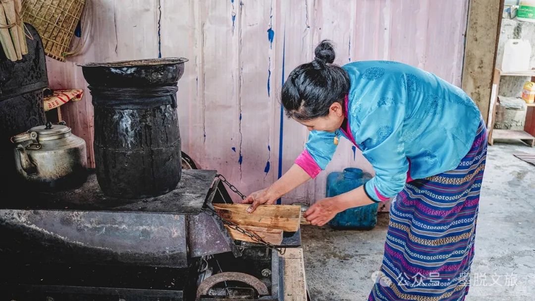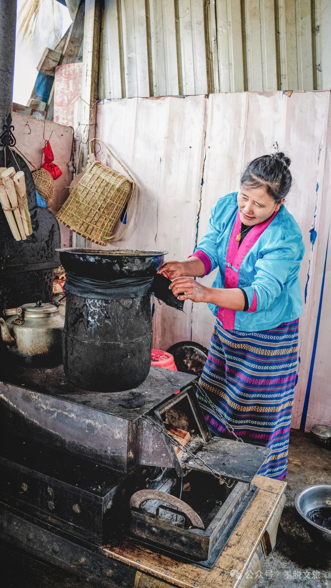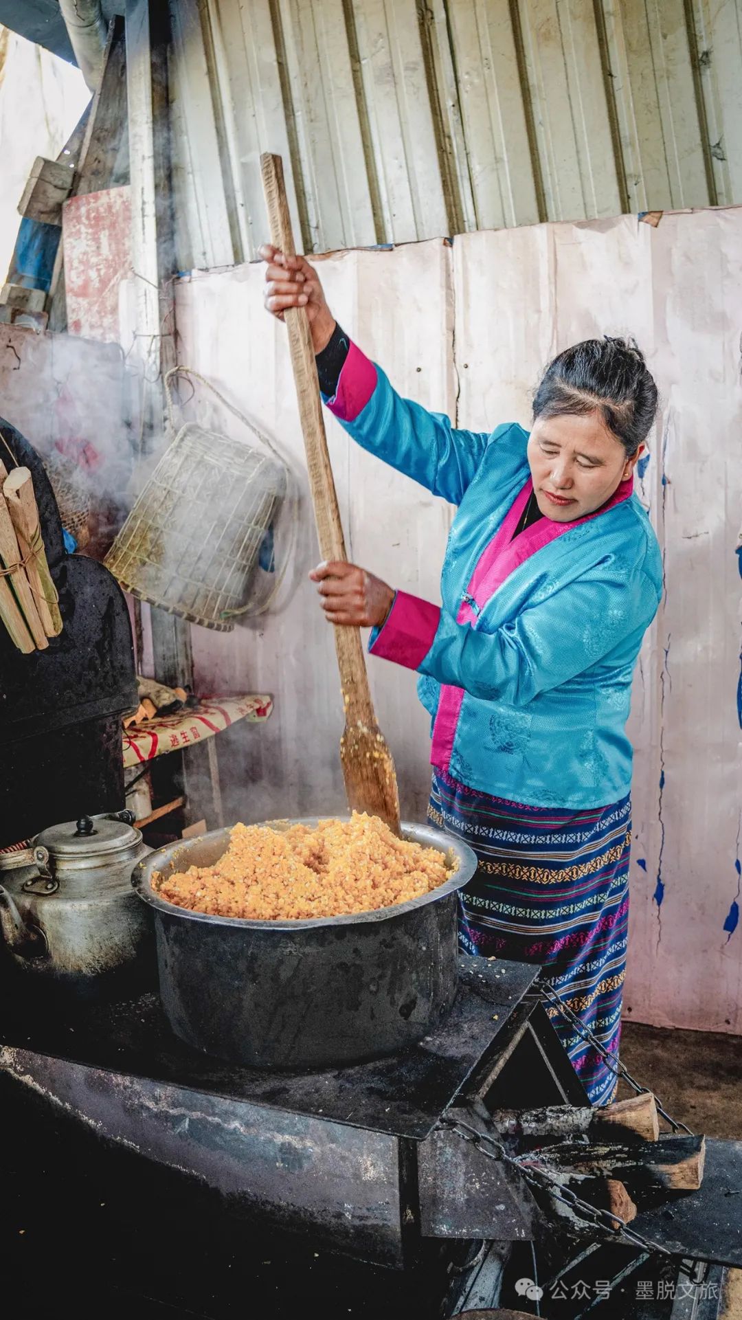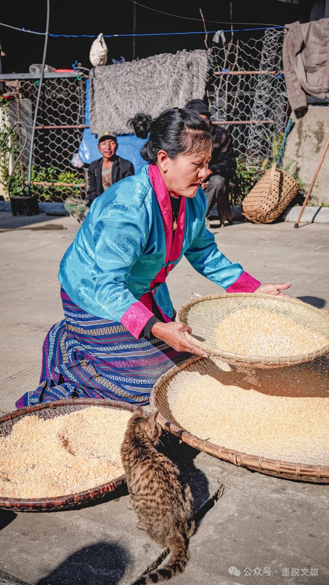 将晒干后的玉米用石磨研磨成细小的颗粒