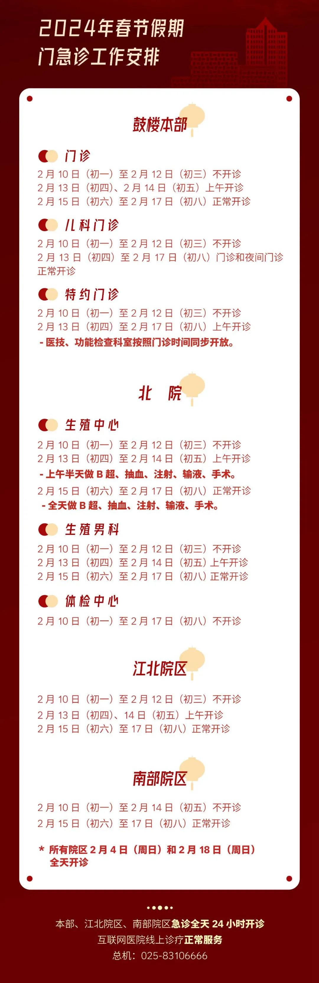 南京鼓楼医院(含江北院区、南部院区)2024春节假期门急诊工作安排