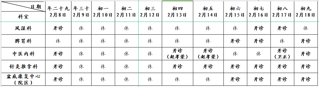 ☑皮肤科、口腔科、妇产科、中医科(含针灸):2月10日至2月12日(初一至初三)停诊,2月13日至2月17日正常开诊