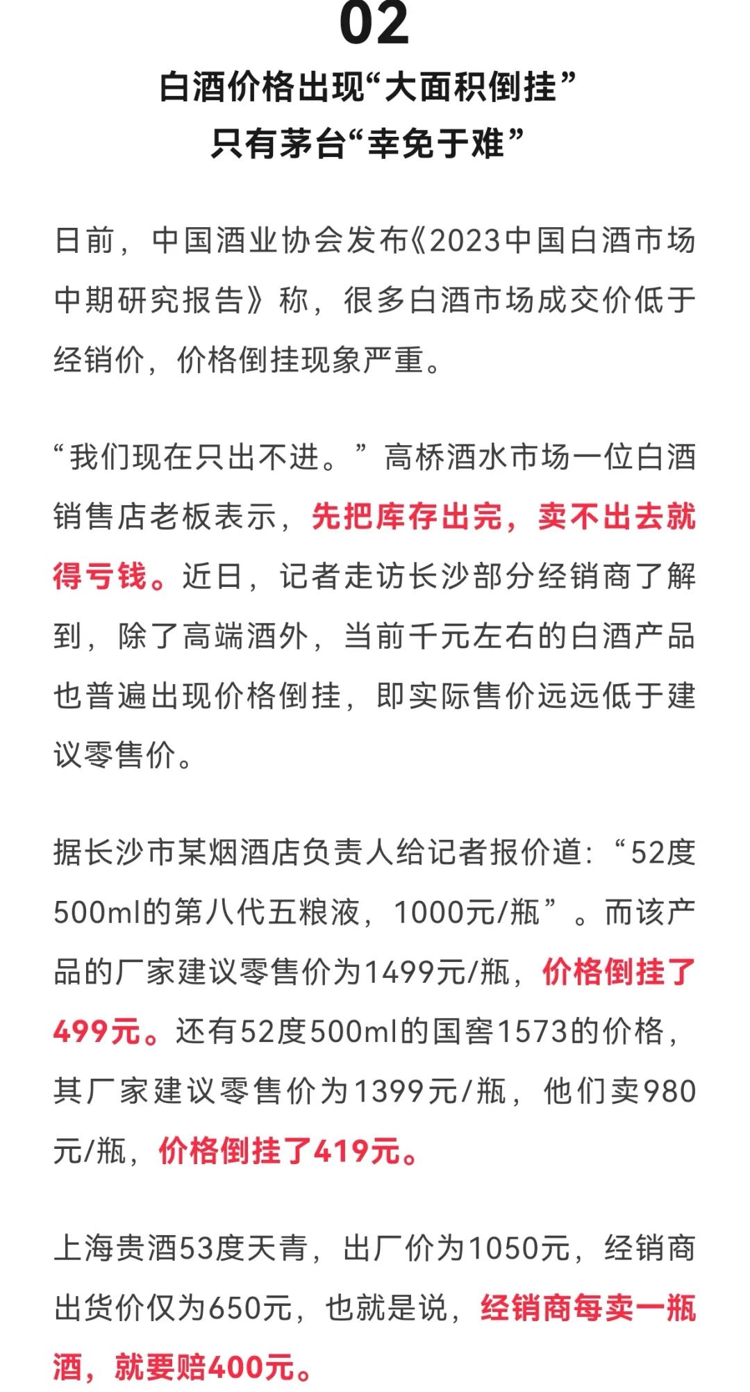 “现在唯一不倒挂的就是茅台,其它高端酒基本上都倒挂了。”长沙一位经销商表示,现在不是为了赚钱,而是要去库存,套现。