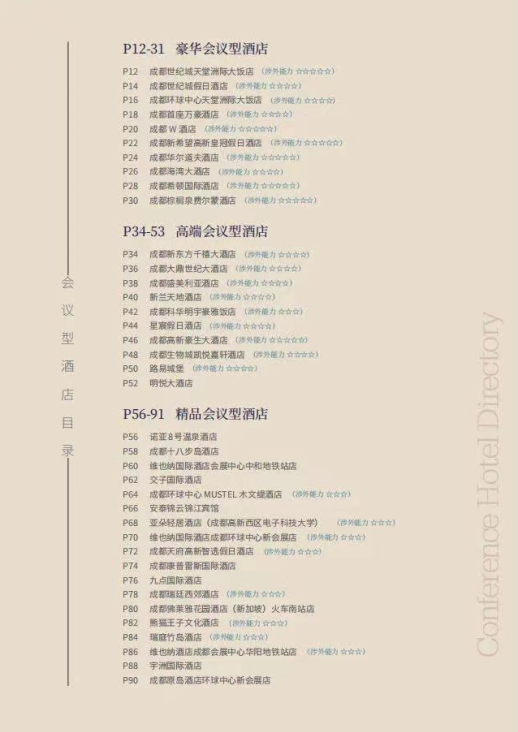 为优化酒店场地资源配置,促进会展业高质量发展,提高高新区会议活动的服务质量,协会受高新区国际合作商务局委托,对区内38家会议型酒店的基本信息、会议接待能力、酒店特色、涉外接待能力等内容进行摸排,编制了《成都高新区会议型酒店推荐手册》。该手册于2023年5月16日正式发布,并提供给了有办会需求的行业商协会、相关企业及其他会展资源方,成为成都高新区酒店及酒店生态行业资源共享、信息互通的指南。