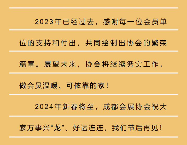 这一年,成都会展协会在推动行业高质量发展的道路上砥砺前行、突破自我、打造IP,每一个成果都凝聚了协会和会员单位们的汗水与智慧,感谢您与我们携手同行,共同成长!