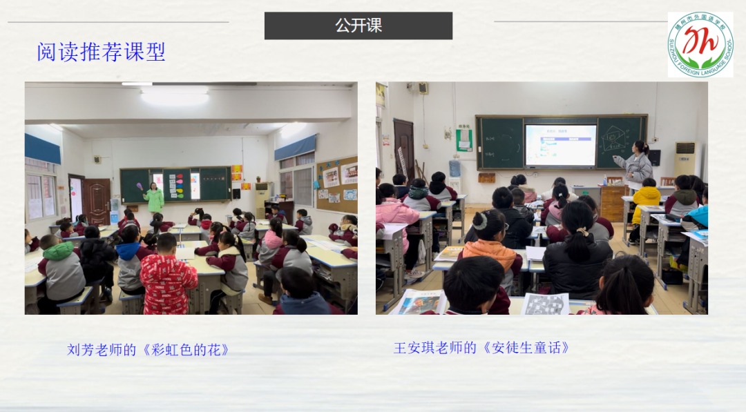 在语文组公开课展示中,阅读推荐课型有刘芳老师的《彩虹色的花》和王安琪老师的《安徒生童话》。