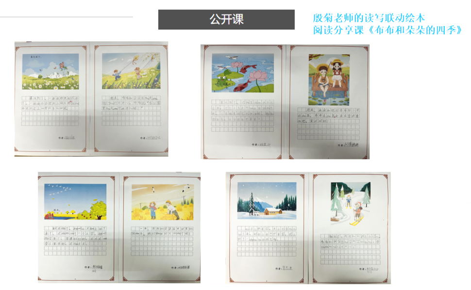 殷菊老师为我们带来的是读写联动的绘本阅读分享课,她创设了为图书馆残缺绘本编故事的任务情境,这是一堂有方法引领、有阅读支架支撑、有活动拓展的多维课堂,一年级的小小萌娃思维活跃、妙语连珠,想象力十分丰富,短短的四十分钟内,不但读懂了残缺的绘本,还合力修复创编了绘本故事《布布和朵朵的四季》,真是了不起!