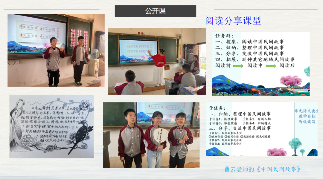 曹云老师的《中国民间故事》阅读分享课上,更是巧妙地进行了任务群的构建,使学生整个阅读活动有规划,有条理、有目的、有思考、有行动、有合作、有评价。这段视频是孩子分别用演唱和弹琴的形式来出题让学生猜民间故事,请大家欣赏。