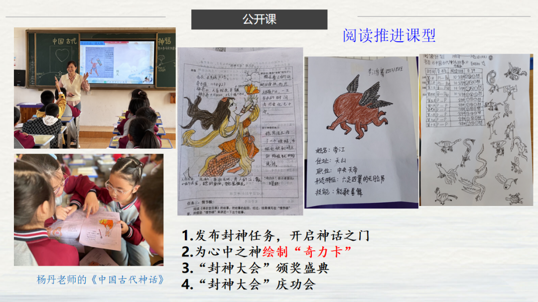 杨丹老师的阅读推进课《中国神话故事》,根据神话的文学体裁特点来设计了任务群,通过完成为神话人物“创作奇力卡”的任务,检验了学生的阅读情况,同时引导学生有机地把文本与图文创作结合起来,在阅读文本中找神话人物的奇貌、奇能、奇器等,从而体会神话内容神奇、想象丰富的特点,感受神话这一传统文化的瑰丽。